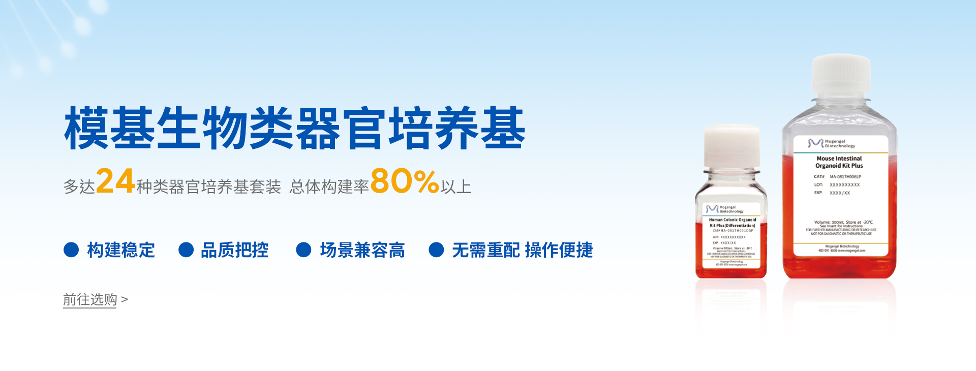廈門模基生物科技有限公司致力于3D細胞培養(yǎng)核心原材料的研發(fā)與產(chǎn)業(yè)化升級,是國內(nèi)一家從科研做起,從實驗研究中一路走來的全流程自主研發(fā)、自主生產(chǎn)的企業(yè)。目前公司的產(chǎn)品有基質(zhì)膠、類器官培養(yǎng)基、細胞因子、3D細胞培養(yǎng)耗材、3D細胞培養(yǎng)智能顯微鏡等。公司擁有4大技術(shù)研發(fā)中心:分子克隆和細胞編輯中心、實驗動物中心、蛋白表達和純化平臺、類器官質(zhì)檢系統(tǒng)和自動化。